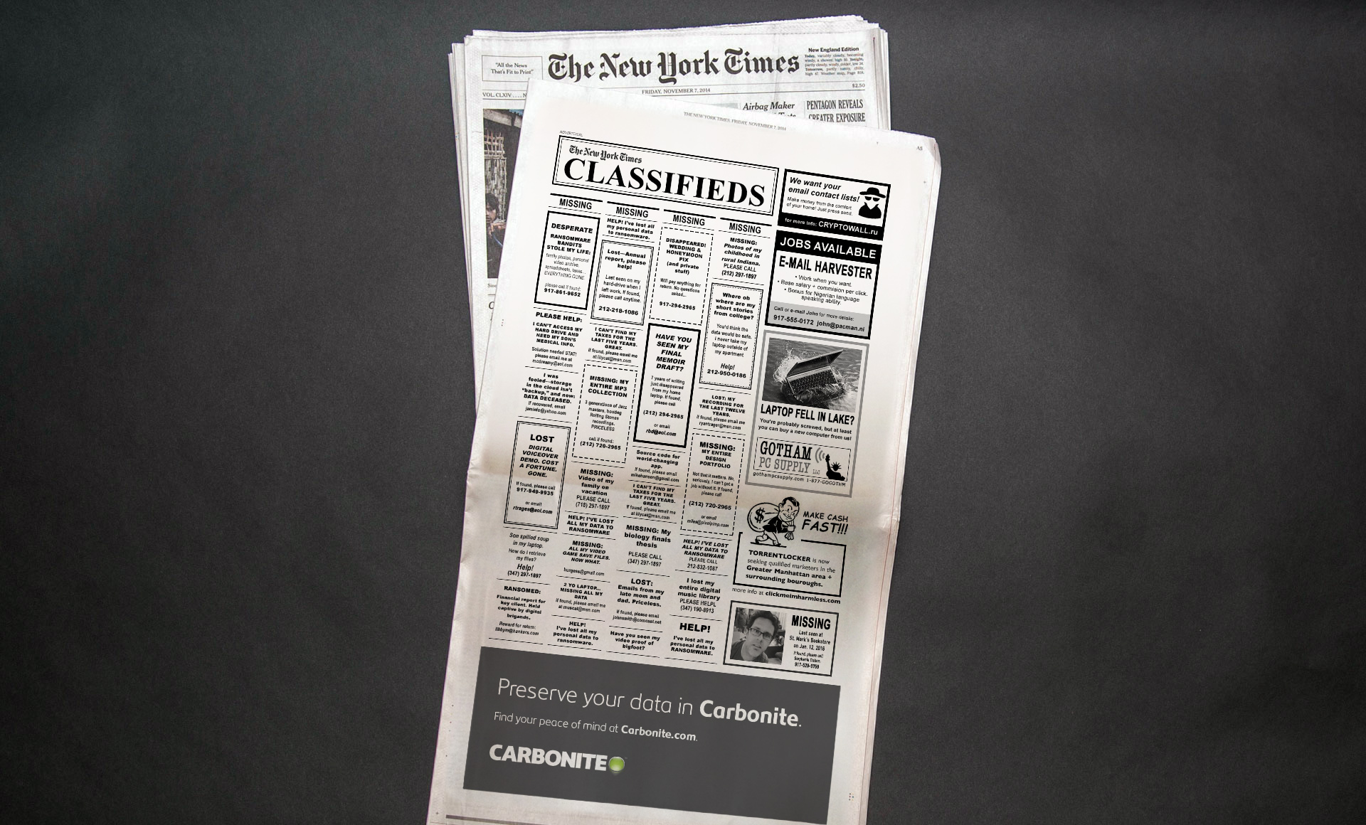All design and art direction was based around this core principle; whether it was designing an advertorial in the New York Times—or creating an interactive banner ad, your data was always safe with Carbonite.