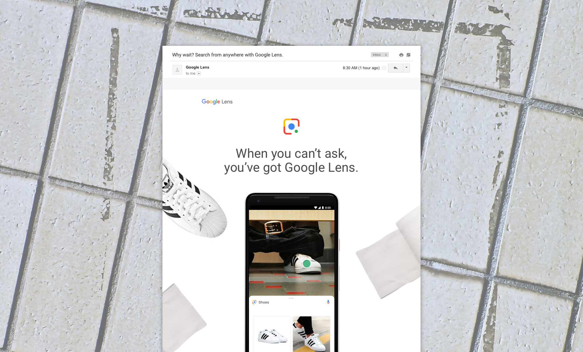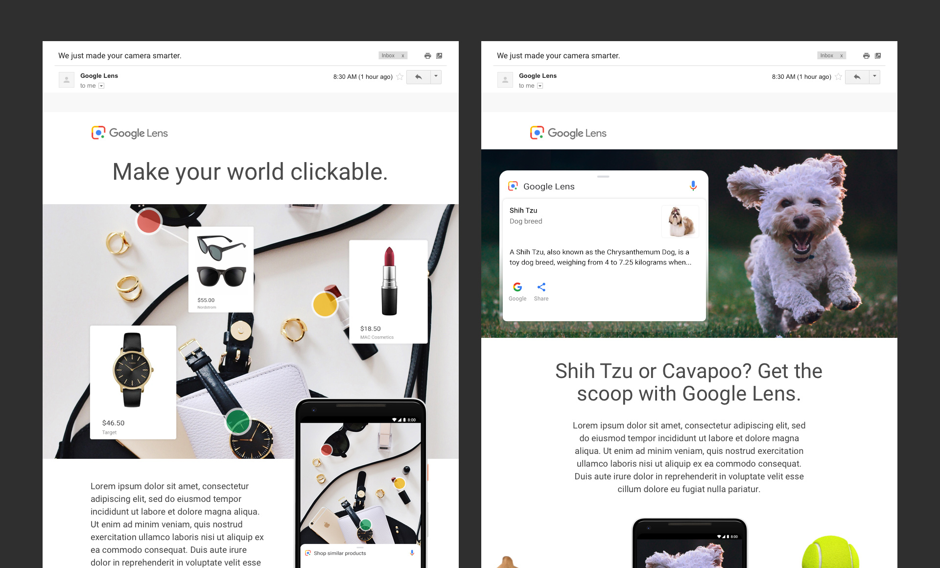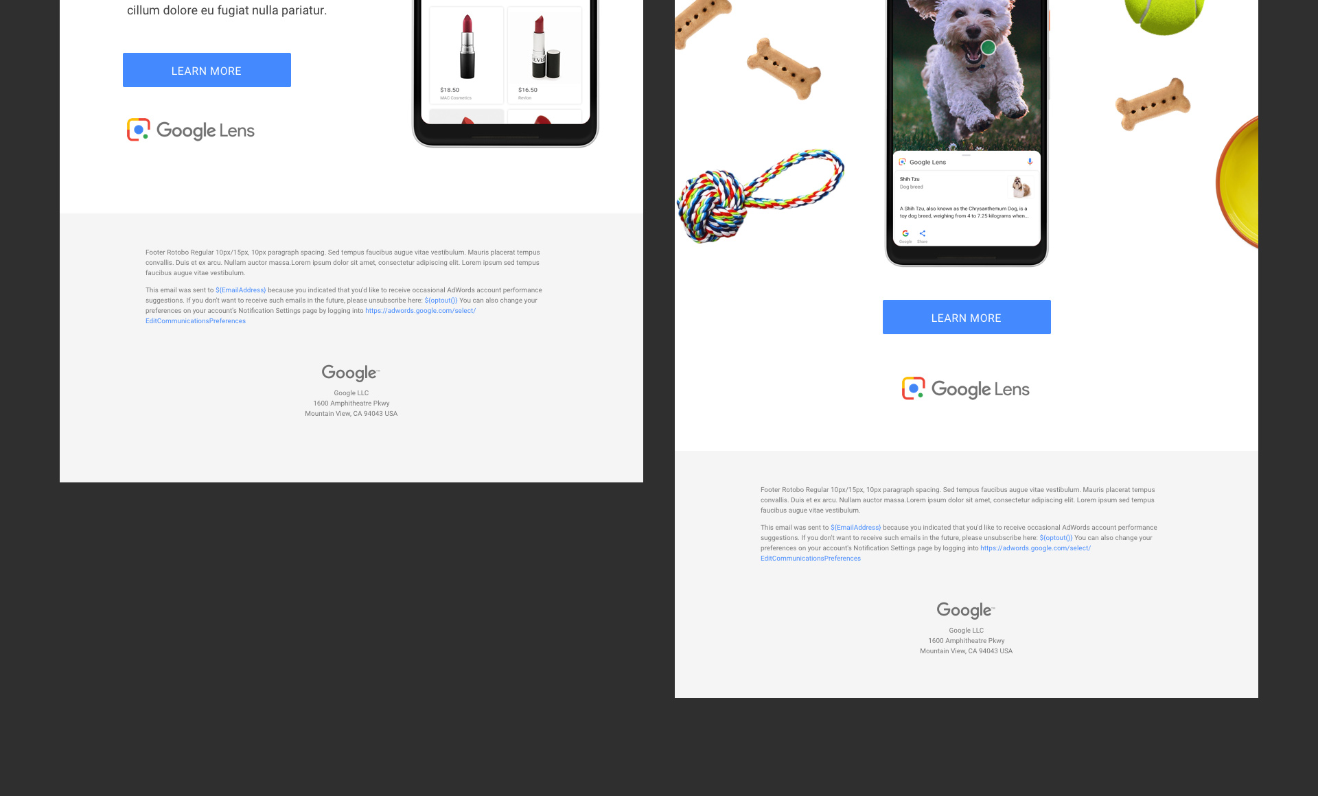Our stakeholders gave us a simple challenge; depict the use of Google Lens in unexpected situations. As long as you have your phone, you have an assistant capable of identifying a cool new look, that puppy in the park, and even shoes you like but are too embarrassed to ask about. The creative I designed help sell through our ability to make a shitty scenario (sorry!) funny, and win us more of their email marketing business at Wire Stone.