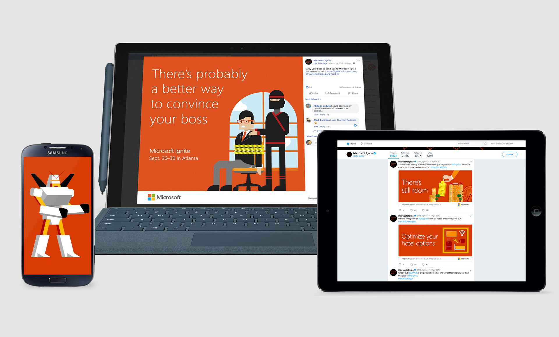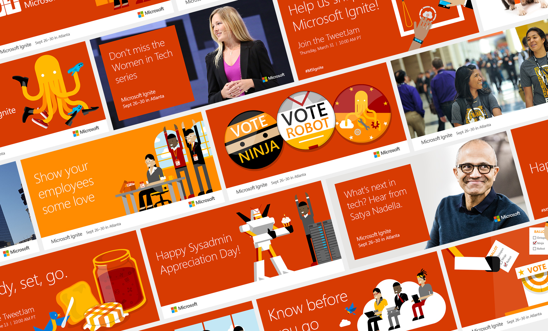 Microsoft Ignite is the company's biggest annual IT conference. We supported their needs by creating compelling social and paid media campaigns which paid homage to the spaces the audience lived in. Using a mix of relevant and fun illustrations—as well as animation—we drove continual engagement before, during, and after the conference.