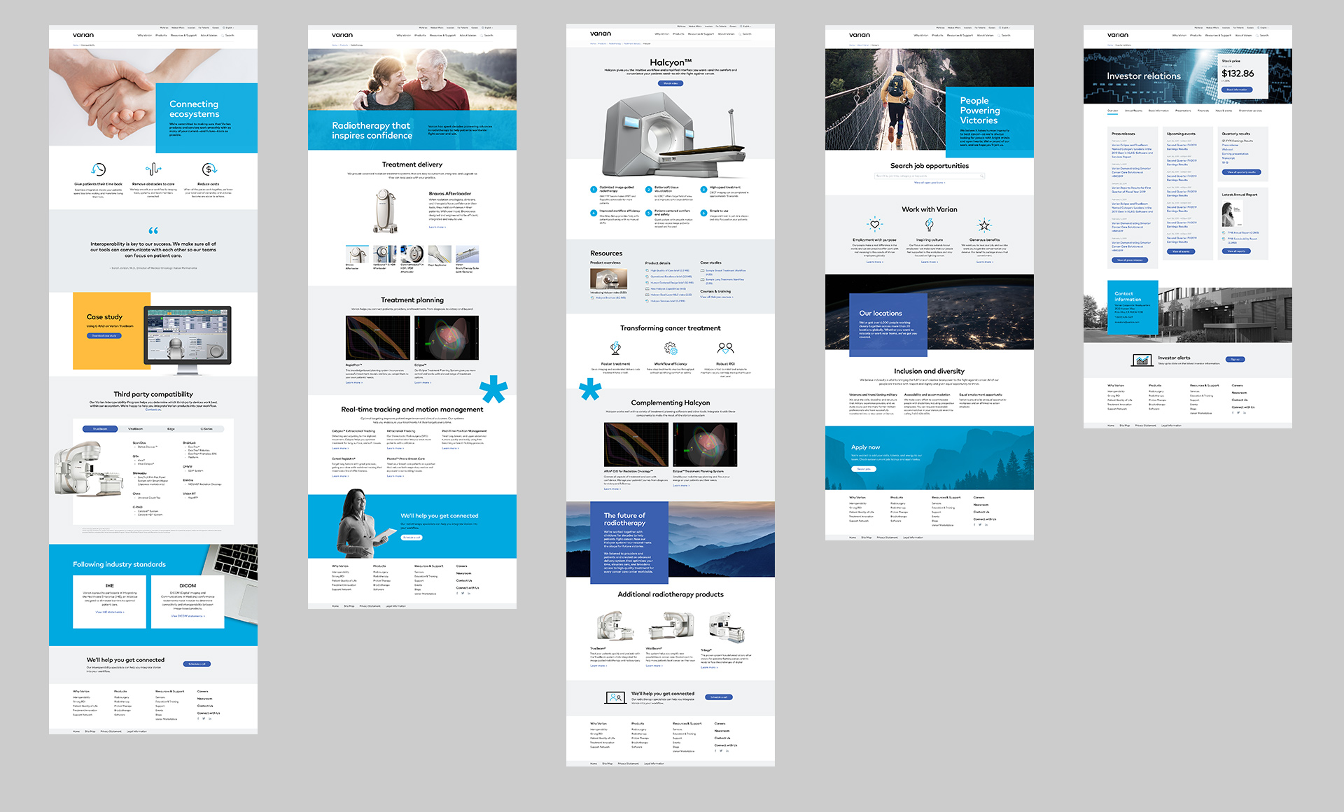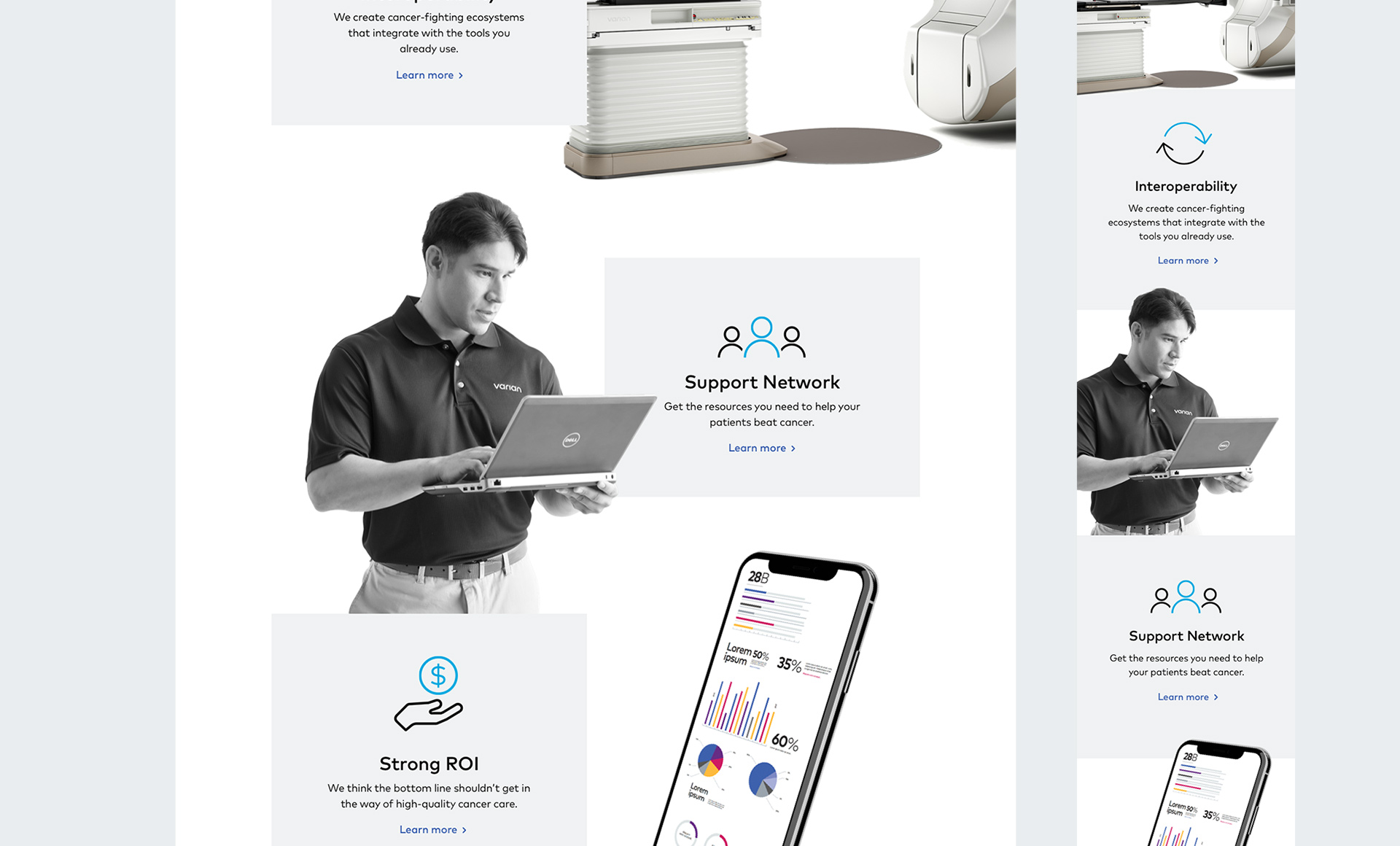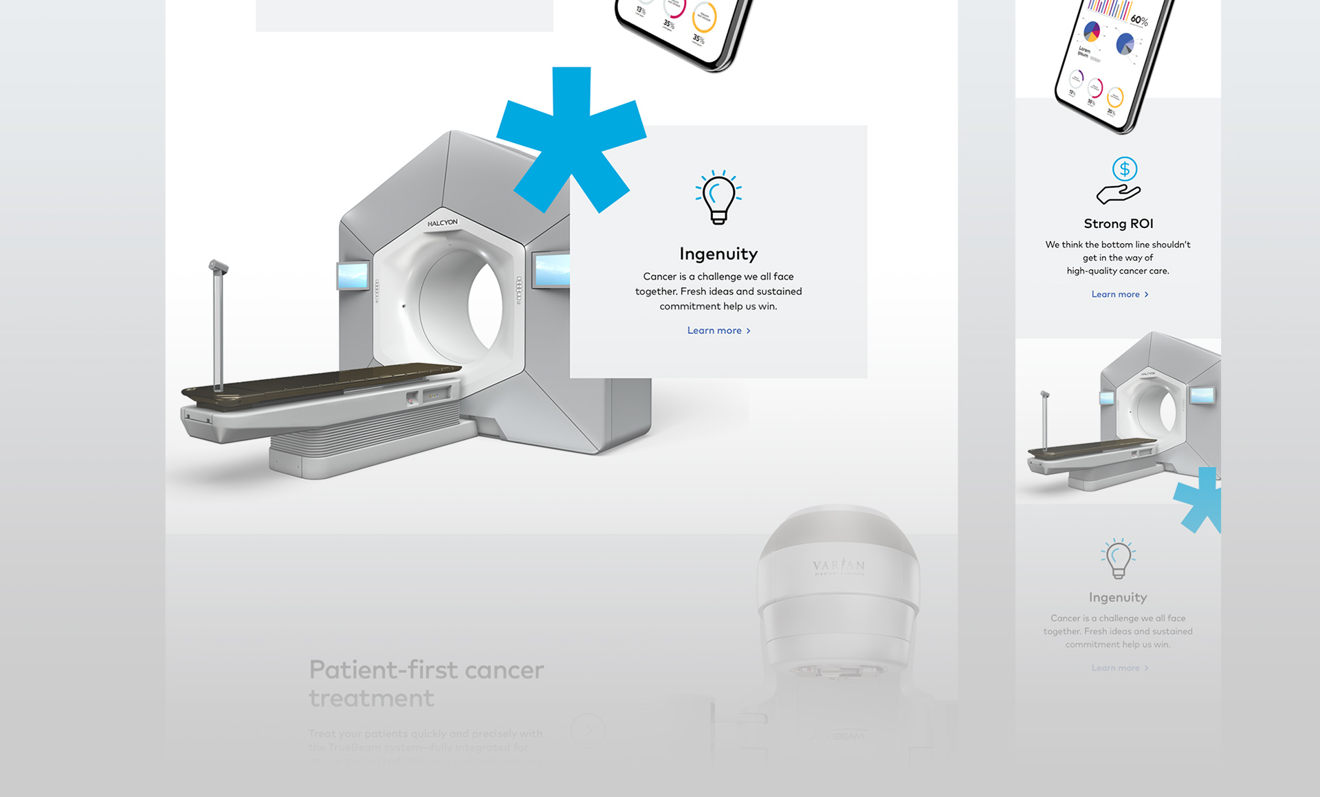 Varian recently updated their brand to reflect a bolder and more human approach to cancer treatment. We created a responsive design system which utlized storytelling, interactivity, and parallax animation to better reflect their new vision while still accomodating the volumes of technical information a customer would need to find easily. The site would also have to be modular, allowing Varian's web team to build new pages via a custom CMS.